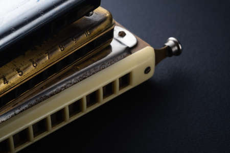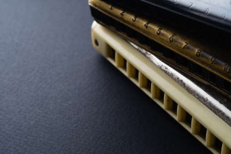 the old two diatonic and one chromatic harmonica, one on top of the other on a dark background. Horizontal orientation. copy space from left