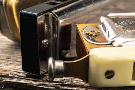 old two diatonic and chromatic harmonica on a dark background. Horizontal orientation. copy space