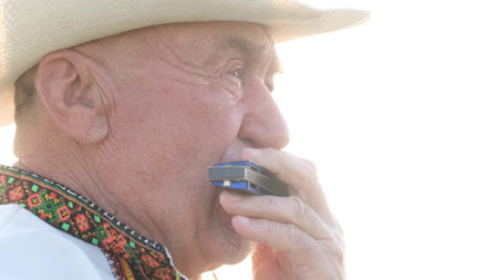 An old Ukrainian grandfather plays the harmonica, he is dressed in an embroidered jacket.