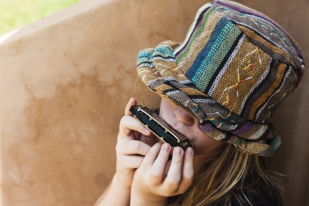 Girl with hat covering her face plays a music note with a mouth organ