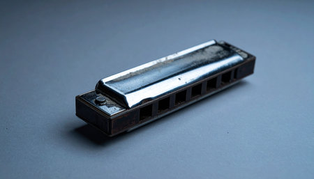 An old, well-loved harmonica rests on a simple surface, its worn metal and wood telling stories of countless blues riffs and folk melodies. A symbol of soulful music, nostalgia, and simple expression.
