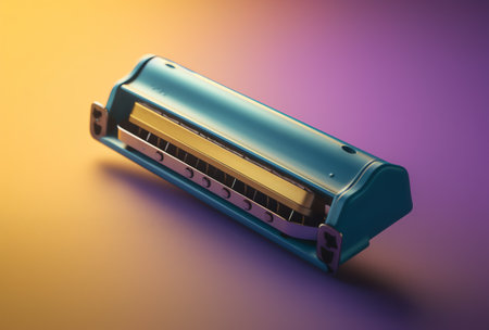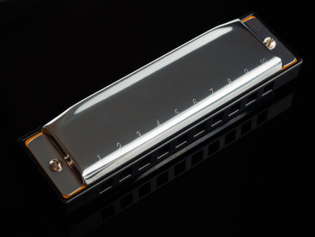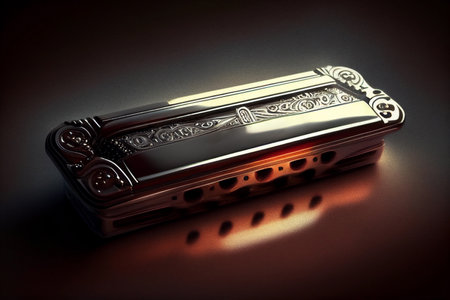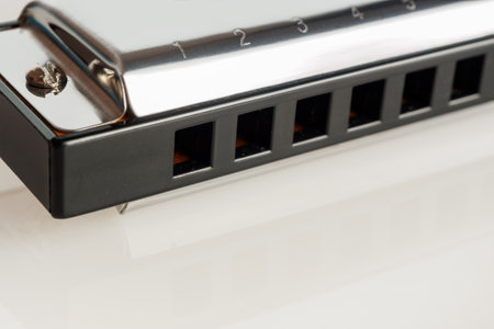 A close-up of the harmonica, highlighting its brilliant details and texture, ready to create the melodies and atmosphere of the music.