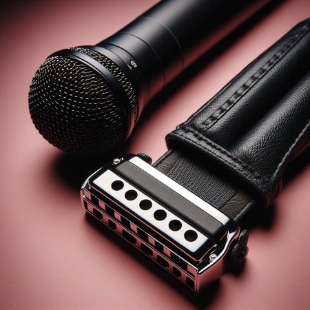 An old, well-used harmonica rests in a single spotlight, its worn metal and wood telling tales of countless blues songs played in smoky bars.