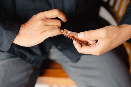 Close up shot of a person cutting their fingernails. The image highlights personal hygiene and the act of grooming. This captures a routine moment of nail care for a clean and healthy look
