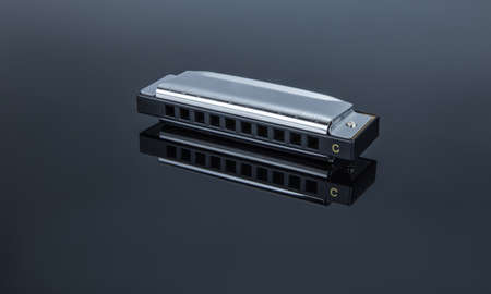 The harmonica lies on a mirrored surface. Classical musical wind instrument.