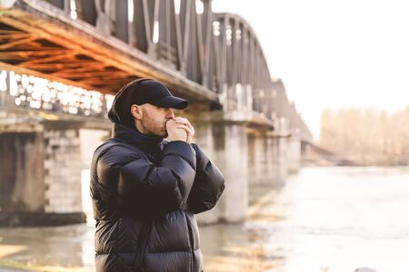 Close-up of a bearded man holding a razor blade in his hands