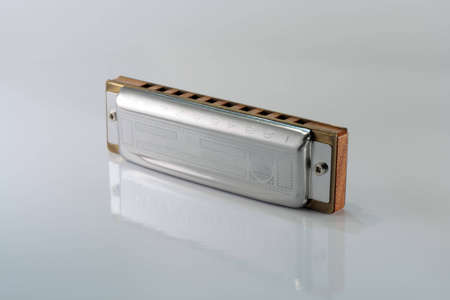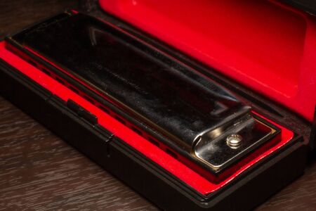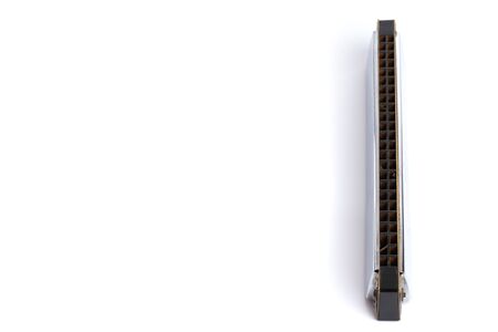 The harmonica lies on a case on a white background. Classical musical wind instrument.