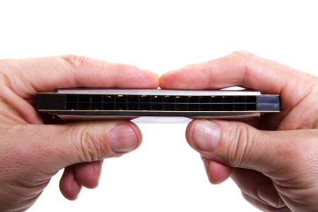 hands with a harmonica on a white background