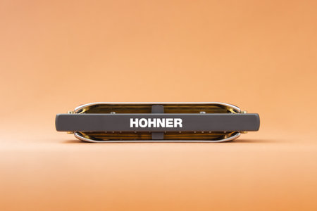 Hohner Rocket professional diatonic harmonica with its lower part in the frame. On a light brown background