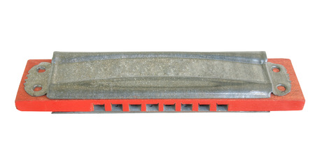 Used small harmonica made from steel and plastic, isolated on white