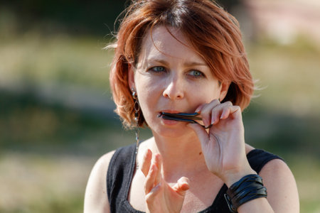 A woman with a red head and black hair is holding a black object in her mouth. She is wearing a black tank top and black earrings