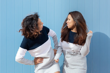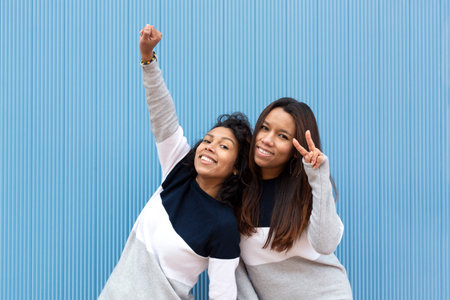 Two hispanic girls in the same dress having fun on a blue background. Friendship concept.