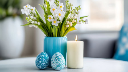 Elegant Easter Lily Bouquet, Candle, and Dotted Blue Eggs on White Table in Bright Interior.