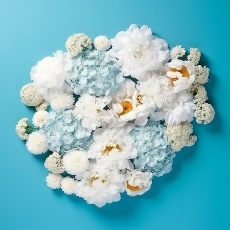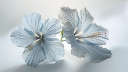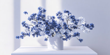 Imagine a stunning cluster of blueandwhite blossoms beautifully displayed on a sleek, stylish platform, perfectly complementing the minimalist elegance of a pure, bright white backdrop