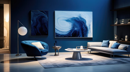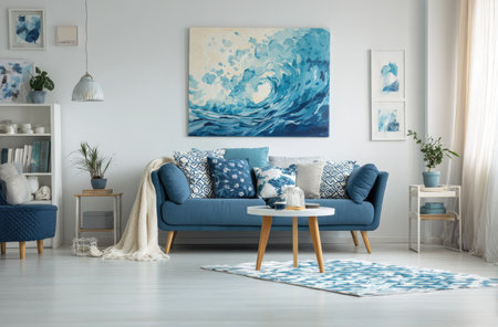 A bright living room featuring blue furniture and stunning ocean view artwork. This serene space combines comfort and modern design for relaxation.