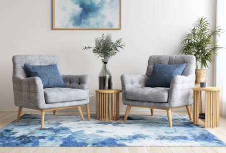 Two armchairs with blue cushions are presented in a bright, indoor setting, accented by wooden side tables, plants, and a rug. The composition benefits from soft lighting and a clean aesthetic. Suitable for editorial and commercial use, this image could be utilized for home decor themes.