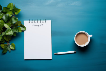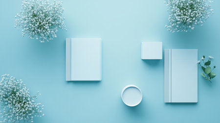 A serene pastel blue workspace featuring books, delicate flowers, and a cup creates a modern and calming atmosphere. Ideal for creative inspiration.