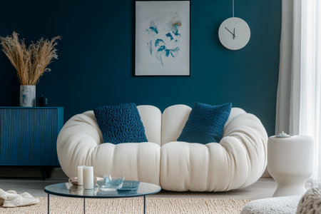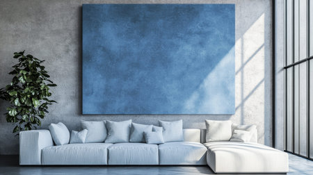 This image showcases a modern living room with a spacious layout, featuring a white sofa adorned with soft cushions and a prominent blue artwork on a textured concrete wall, creating a serene and stylish atmosphere.