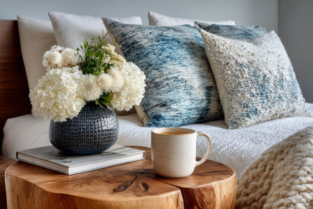 Cozy bedroom with round wooden bedside table, flower vase, and coffee mug