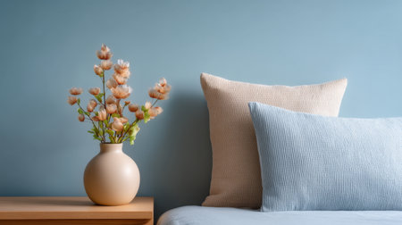A calming interior scene featuring a light blue wall, cozy throw pillows, and a simple flower vase on a wooden table, designed for modern living spaces.