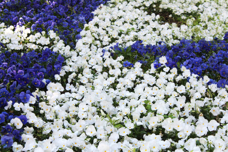 Beautiful white and blue pansy flowers in the spring, summer garden. Natural floral background