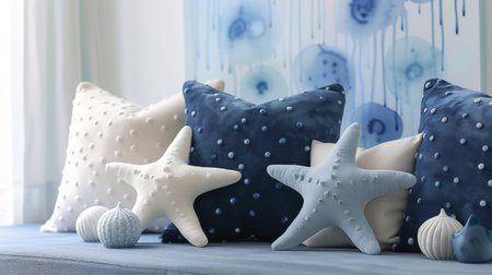 Coastal Living Room Decor with Blue and White Pillows and Starfish Cushions.