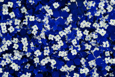 A cloud of white and blue flowers on a blue background, beautiful floral natural wallpaper