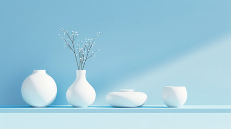 A set of white ceramic vases in a minimalist style displayed against a soft blue background. Clean, modern design suited for contemporary decor or art visuals.
