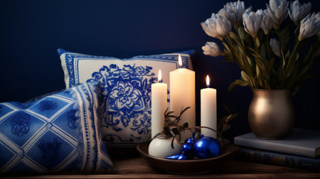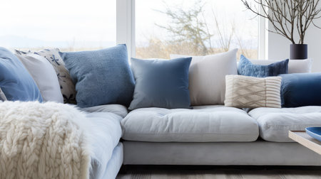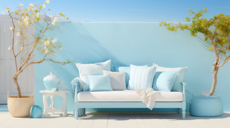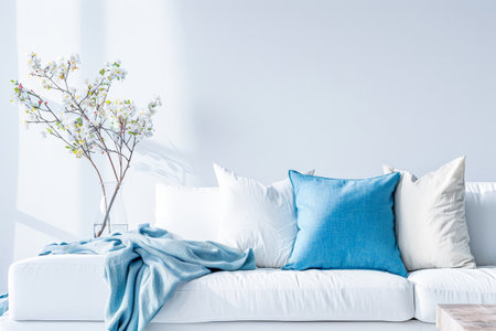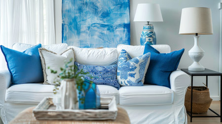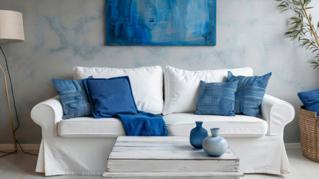 white sofa with blue cushions to contextualize the decoration pieces. generative ai