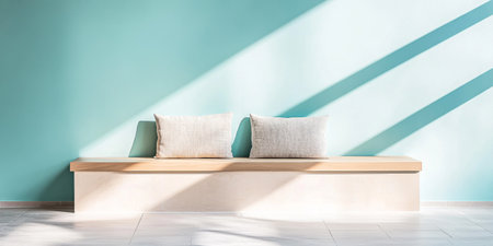 A serene interior showcases a simple wooden bench adorned with two soft pillows, positioned against a teal wall. Sunlight streams in, casting gentle shadows on the floor.