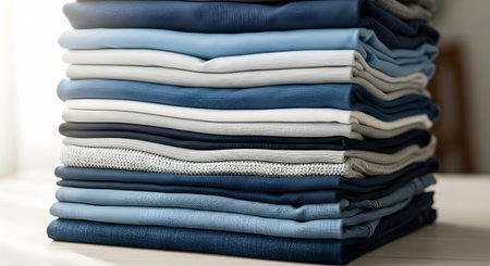 A high stack of neatly folded clothes in various shades of blue and grey, including denim jeans and t-shirts. The pile represents laundry organization, textile textures, and wardrobe management.