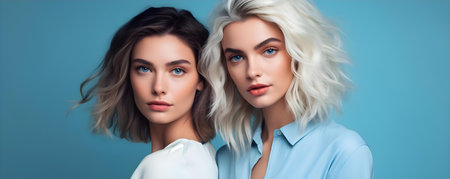 Two pretty cheerful girls in glasses are posing in studio over blue background. Beauty, fashion. Optics, eyewear.