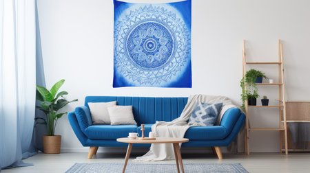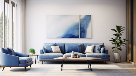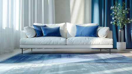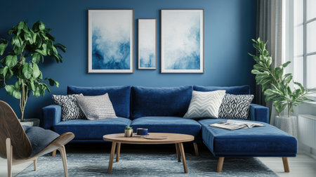 A modern living room features a blue sofa adorned with pillows, complemented by a coffee table and artwork. The composition includes a rug and plants, enhanced by natural lighting. This setting could be used in interior design projects or lifestyle publications.
