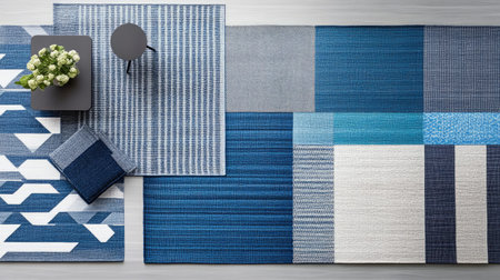 Stylish area rugs in various shades of blue create a modern interior space. Minimalist furniture adds a touch of elegance and warmth to the setting.