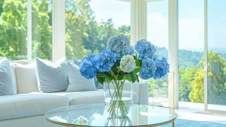 A stunning arrangement of blue hydrangeas sits elegantly on a glass table in a modern living room, showcasing scenic views and abundant natural light.
