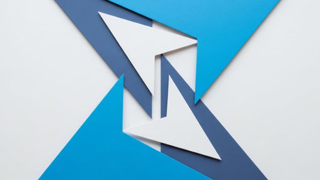 A minimalist abstract composition is presented, featuring precisely cut geometric shapes. Overlapping triangles and arrow-like forms in shades of blue, navy blue, and white create a dynamic and visually engaging arrangement. The sharp angles and clean lines suggest a sense of precision and direction. The white background provides a stark contrast, allowing the colored to stand out. This arrangement evokes themes of strategy, movement, and modern principles.