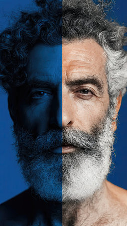 Portrait of a man with a gray beard and mustache on a blue background
