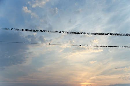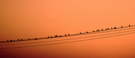 During a tranquil sunset birds perch along power lines creating a serene scene against a warm and vibrant sky.