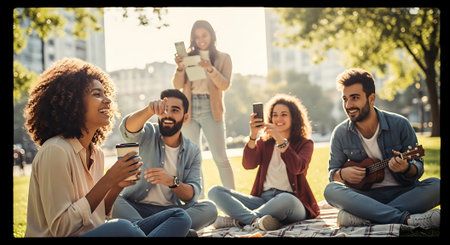 A cheerful group of friends sitting on a blanket in a park, using smartphones and playing a ukulele, enjoying a sunny day outdoors.