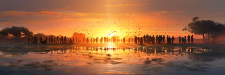 Silhouettes of people standing on the beach watching beautiful sunset over the ocean with flying birds