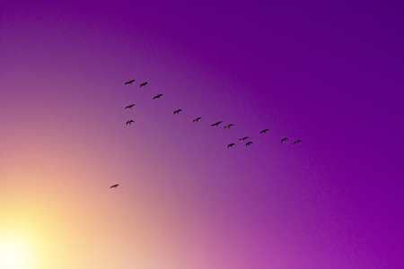 amazing phenomenon of partial sun eclipse over silhouette birds flying on sea and sunset sky