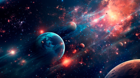 Explore a mesmerizing cosmic scene showcasing colorful nebulae, distant planets, and sparkling stars, perfect for projects celebrating the beauty and wonder of outer space.
