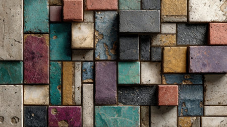 Tiles in various colors and textures are arranged together on a wall. The design shows a mix of shapes and patterns made from stone and cement materials.