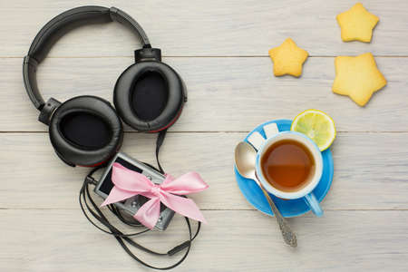 Player with headphones and tea