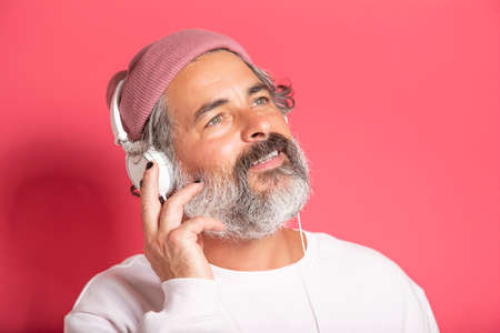 Dark gray haired middle aged man 40s 50s in casual sweater listening to music with headphones isolated on pink background studio portrait