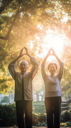 Generative AI : Mature retired family husband and wife practicing advanced couple yoga position on mat in city park on sunny morning senior man holding his female partner woman on