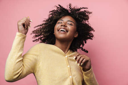 Happy african american woman dancing and laughing at camera isolated over pink wall