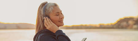 Excited woman smiling and listening to music with water in the background. Happy young female enjoying tunes on her online streaming playlist while outdoors. Using wireless headphones play songs