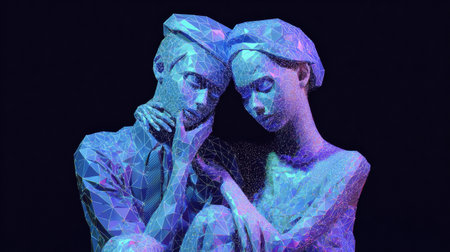 Two stylized figures express intimacy through an intricate geometric design, blending colors and shapes to convey a sense of connection and emotion.