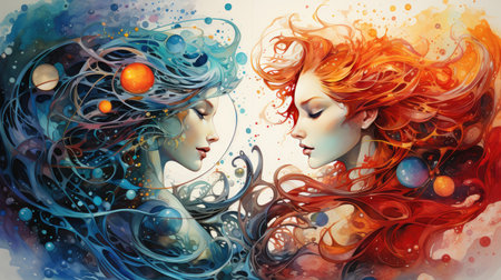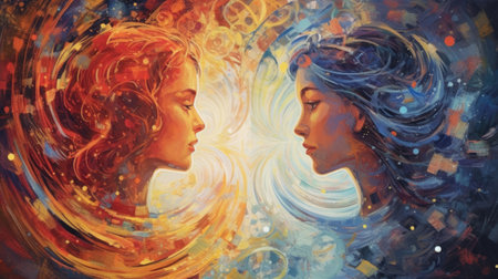 Cosmic gemini twins with vibrant neon colors for astrology and zodiac themes